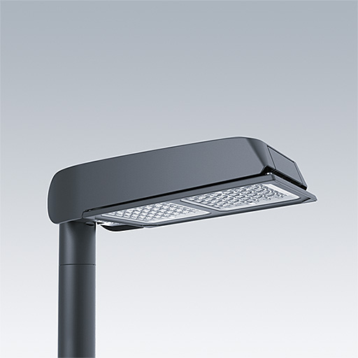 Lanterne d’éclairage routier LED de taille Large avec 60 LED et une optique Route étroite 700mA. Electronique,Classe électrique II, IP66, IK08. Corps : aluminium (EN AC-44300) Moulage sous pression, gris anthracite 900 sablé thermopoudré. Fermeture : verre plat trempé. Cadre blanc avec un bord gravé. Vis : Acier inox, traitement Ecolubric®. Livré avec un adaptateur d’emmanchement Ø 76 mm qui convient pour montage top (inclinaison 0°/5°/10°) ou latéral (inclinaison -20°/-15°/-10°/-5°/0°). Equipé d’un circuit de réduction de puissance, contrôlé par un câble à phase commutée supplémentaire. MARCHE = 100 %, ARRET = 50 %. Livré avec LED 4 000 K. Protection contre la surtension : mode commun à une impulsion 10 kV et mode commun multi-impulsions 8 kV et mode différentiel multi-impulsions 6 kV. Si un système DALI permanent est connecté, mode différentiel et mode commun multi-impulsions 6 kV.