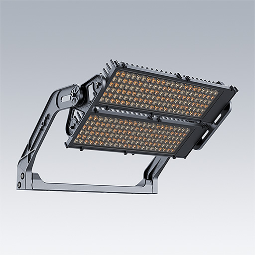 Projecteur LED haute puissance avec distribution lumineuse Optique 1 : extra large; Optique 2 : extra large; de 264 LED. Appareillage externe, Fourni uniquement par Thorn Lighting, à commander séparément (courant de transmission maximum 850mA) et câblage via câble de type H07 RN-F et mini-diamètre de 13 mm. Classe électrique I, IP66, IK08. Dissipateur thermique : Moulage sous pression aluminium thermopoudré gris foncé (similaire à RAL 7043). Support de fixation et cadre : gris foncé (similaire à RAL 7043). Fermeture : 4 mm transparent verre. Fourche montée à l’aide des points de fixation disponibles (une vis M20 et deux vis M14). Fonctionnement à faibles papillotements (< 1 %) adapté à une diffusion TV haute définition. Luminaire avec balance des blancs Équipé d’un circuit imprimé noir pour réduire les fuites lumineuses.