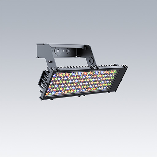 Projecteur LED haute puissance avec distribution lumineuse Optique 1 : faisceau étroit; de 132 LED. Appareillage externe, Fourni uniquement par Thorn Lighting, à commander séparément (courant de transmission maximum 850mA) et câblage via câble de type H07 RN-F et mini-diamètre de 13 mm. Classe électrique I, IP66, IK08. Dissipateur thermique : Moulage sous pression aluminium thermopoudré gris foncé (similaire à RAL 7043). Support de fixation et cadre : gris foncé (similaire à RAL 7043). Fermeture : 4 mm transparent verre. Fourche montée à l’aide des points de fixation disponibles (une vis M20 et deux vis M14). Fonctionnement à faibles papillotements (< 1 %) adapté à une diffusion TV haute définition. Luminaire avec teintes de lumière RGBW (rouge, vert, bleu, blanc), 4000 K en Ra > 90 Équipé d’un circuit imprimé noir pour réduire les fuites lumineuses.