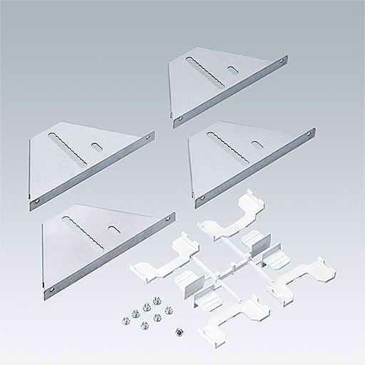 Kit d’installation (x 4) consistant en supports et cales à enfoncer qui peuvent être ajustés en hauteur pour veiller à ce que le luminaire soit à ras de la structure du plafond. Pour la compatibilité du plafond et de câbles, voir la notice d’installation.
