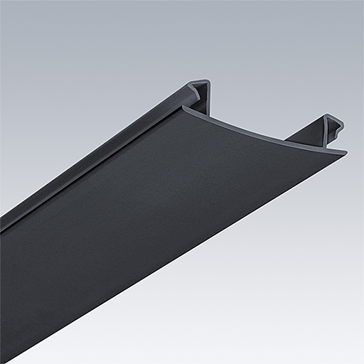 Afdekstrips voor draagrail of kabelkanaal in polypropyleen in zwart. Afmetingen 1498 x 46 x 10 mm, gewicht: 0,1 kg