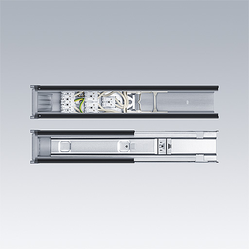 Voedingskit L500 in zwart gemaakt van geprofileerd staalplaat voor elektrische aansluiting van de continue rij. Kit bestaat uit twee eenheden: het ene met de klemmenblokken voor de elektrische aansluiting en het andere is een mechanisch onderdeel. Samen bereiken ze de lengte van 500 mm waarmee de lijn volledig kan worden uitgerust en bedekt met CONTUS armaturen. Insteekbare aansluitpunten voor 5 voedingskabels, 2 x 2 kabels voor noodverlichting en 2 stuurleidingen. Omvat eindkappen en beschermende doppen om onbedoeld contact met elektrische geleiders te voorkomen.