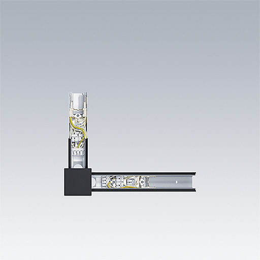 L-vormige mechanische en elektrische connector, zwart. Met één vrouwelijke en één mannelijke uiteinden voor mechanische aansluiting en 2 groepen klemmenblokken voor elektrische invoer of uitvoer.