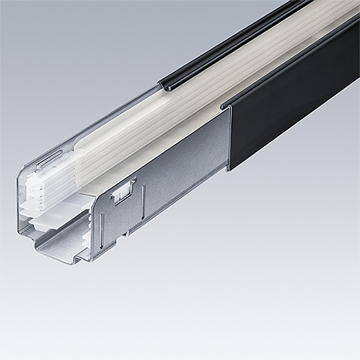 Draagrailunits in geprofileerd plaatstaal met een poedercoating van zwart polyesterlak. 5 voedingskabels (5 x 2,5 mm²/16 A) plus 2 x 2 geleiders (4 x 1,5 mm²/10 A) voor het integreren van noodverlichting aan de hand van twee onafhankelijk geïsoleerde stroomkringen, plus 2 stuurleidingen (2 x 1,5 mm²/10 A). Aansluiting zonder gereedschap met elektrische voedingskit.