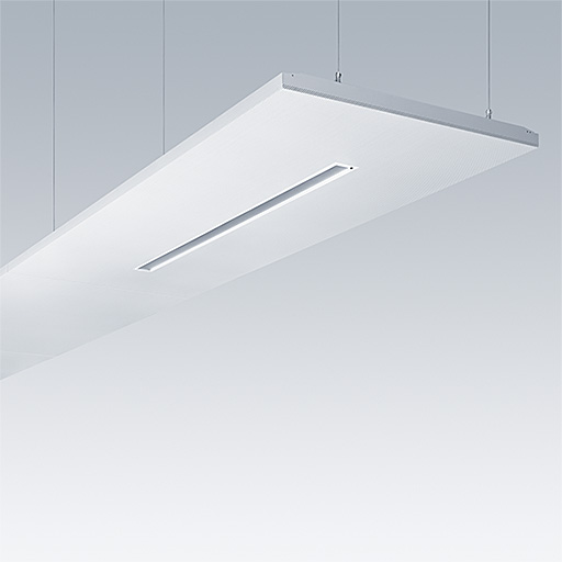 Een gependeld architecturaal vlot met een direct/indirect led-armatuur en sensorregeling (daglicht / beweging / op afstand) aangesloten op de DALI-bus. Elektronisch, DALI dimbare aansturing met 3 uur veiligheidslicht en zelftest / DALI-adresseerbare test. elektrische Klasse I, IP20. Vlot- en armatuurframe: aluminium. Optiek: vlak acryl. Geleverd met een 6-pins Wieland-stekker aan 3,4 m 6-aderige kabel en op een paneel gemonteerde 6-pins Wieland-contrastekker voor doorvoerbedrading. Geleverd met ophangkabels. Compleet met 4000K LED.