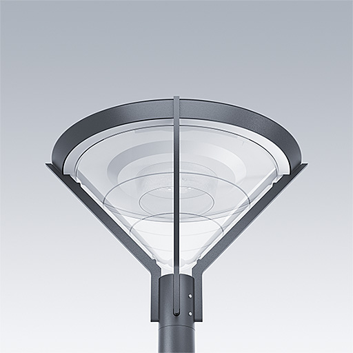 Decoratieve lantaarn met paalmontage voor (geen) met symmetrisch lichtverdelingscurve. klasse II elektrisch, IP66 en IK08. Basis en armen: drukgegotenaluminium (EN AC-46000), Kap: gedraaidaluminium, alle poedergelakt donker zand-grijs 900 (benaderend RAL 7043). Afdekking: gematteerd polycarbonaat (PC). Schroefbevestigingen: roestvrij staal. Compleet geleverd in één doos, voorbedraad met 4m HO5 VVF kabel. Overspanningsbeveiliging: 10 kV common mode, één puls; 8 kV common mode, meerdere pulsen; 6 kV differentiële mode, meerdere pulsen. Als een permanent DALI-systeem is aangesloten: 6 kV common mode en differentiële mode, meerdere pulsen. Compleet met 3000K LED