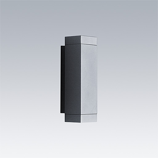 Axyl Glow, wandopbouw, architecturale LED-armatuur voor decoratieve gevelverlichting, 2 ramen met brede lichtbundel; elektrische klasse III. DALI-2 dimbaar, externe LED driver. IP65, schokweerstand: IK06. Behuizing: drukgegoten aluminium, poedergelakt in getextureerd grijs (RAL9006). Bedrijfs-/omgevingstemperatuur: -20°C tot +50°C. Compleet met 2700K LED..