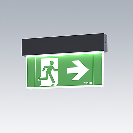 LED-vluchtwegarmatuur voor opbouw-, wand- of plafondmontage; Armatuur voor centrale veiligheidsverlichting, voor enkelvoudige armatuurbewaking via Powerline samen met eBox-systeem, adressering en instelling van niet-beheerde/beheerde modus mogelijk via eBox-systeem, beheerde modus als standaard , behuizing in polycarbonaat zwart, spuitgegoten; de armatuur is eenvoudig te installeren; quick-fit-klem, doorvoerbedrading mogelijk tot 2,5 mm²; geleverd met een set monteerbare vluchtwegsymbolen conform ISO 7010 (links, rechts, naar boven, naar beneden en leeg), zichtbaar vanaf een afstand van maximaal 23 m; onderhoudsvrij dankzij LED-technologie; levensduur 50.000 h bij constante lichtstroom; gelijkmatige achtergrondverlichting van het pictogram; lichtsterkte > 500 cd/m² in het witte bereik volgens DIN4844. Voeding: 220/240 V AC (+/- 10%) 50/60Hz; 176-280 V DC. Armatuurvermogen: 3 W; beschermingsniveau: IP40, beschermingsklasse: klasse II elektrisch; slagvastheid: IK03; omgevingstemperatuur: 0°C tot +40°C. Afmetingen van de armatuur inclusief vluchtwegsymbool: 330 x 45 x 190 mm; gewicht: 0,57 kg